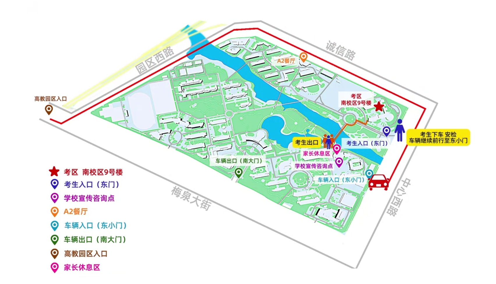 2.考生必须在南校区东门(详见附件2)核验身份信息后进场。因考试当天人流量较大,建议考生和家长尽量以公共交通方式出行。